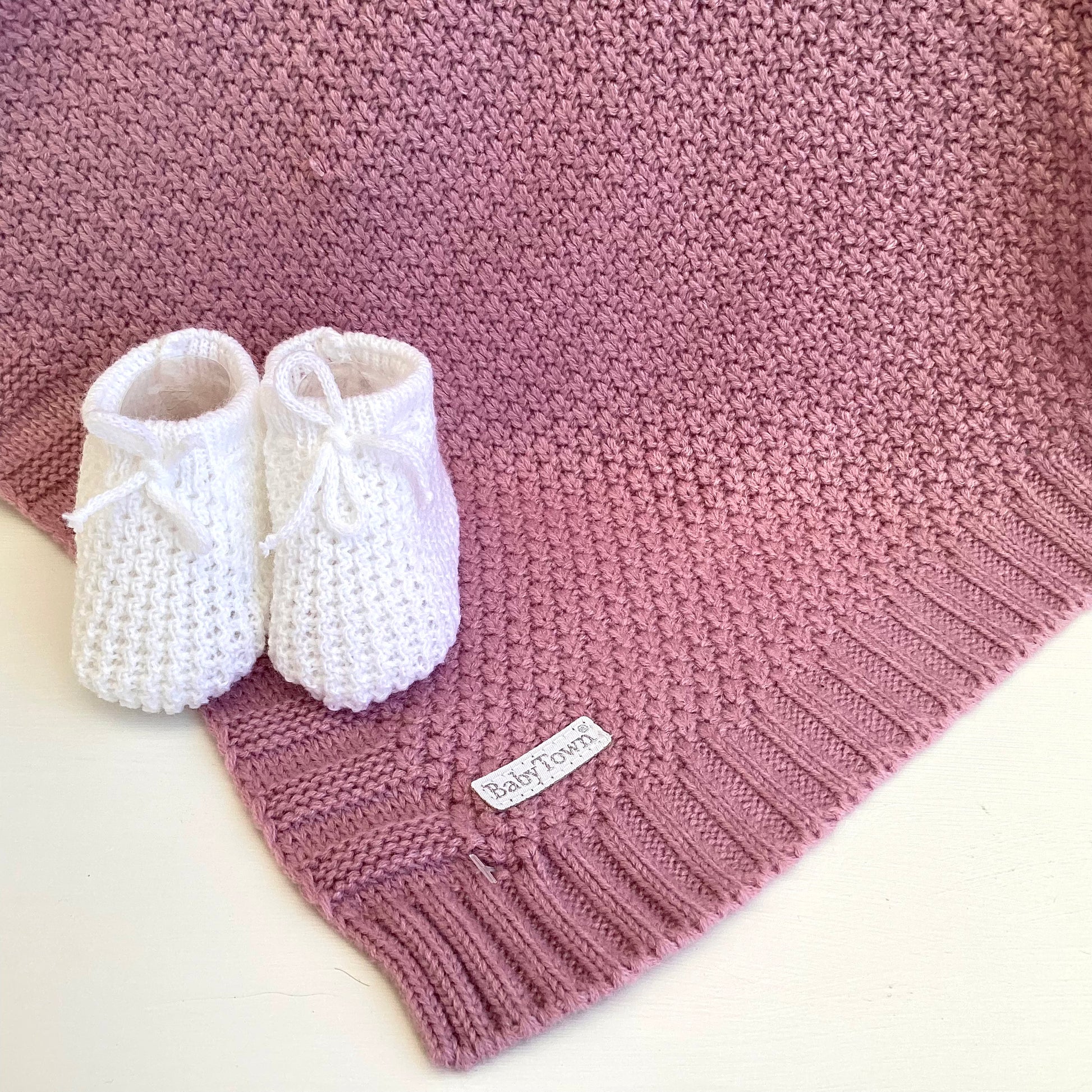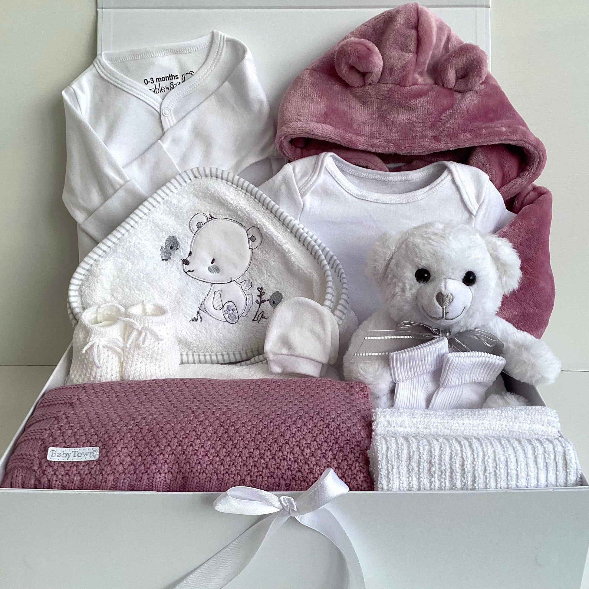 Our face cloths are soft and sensitive on babies skin during bath time. Wrap baby in our Soft Touch hooded bath towel to get her warm and dry Our beautifully presented gift box also includes a high quality matching knitted blanket which is the ideal way to keep baby warm at bedtime. A soft and comfortable sleep suit and vest will help baby have a good nights sleep whilst cuddling our lovely fluffy bear who will make a lovely friend for a little one . We have also included some essentials with scratch mitts, socks and the cutest knitted booties 💕