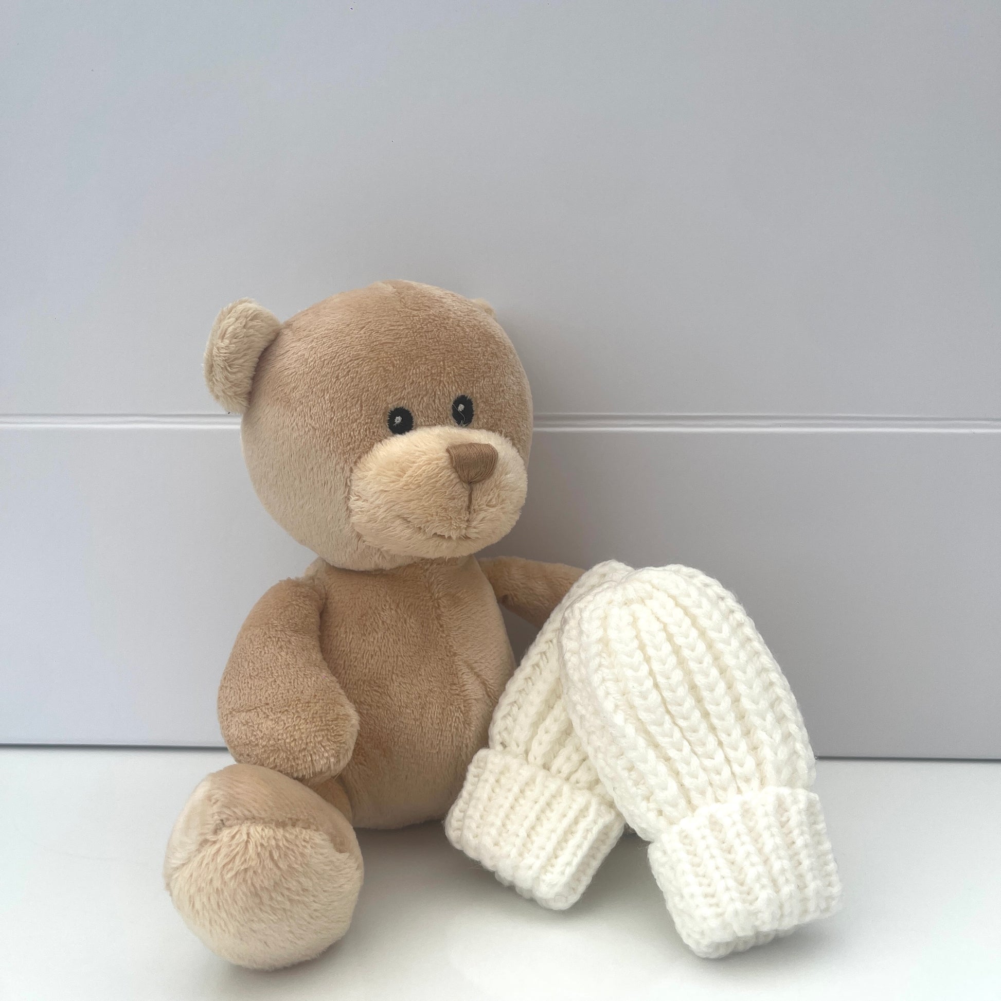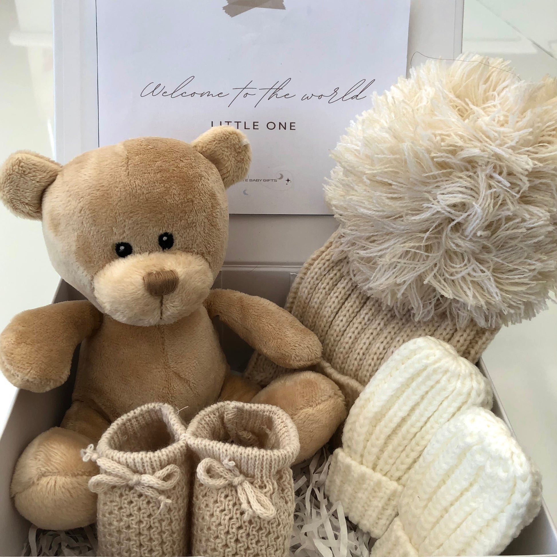 With a soft and luxurious texture Billie is the perfect cuddly friend providing warmth, comfort and cuddles for your little one. Our beautifully presented gift box also includes a warm and cosy knitted bobble hat, with cream knitted mitts and the cutest beige knitted booties to complete the outfit. 🤍