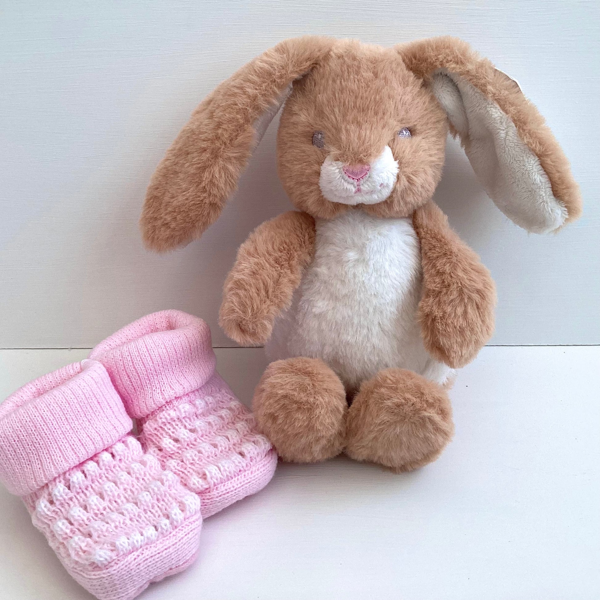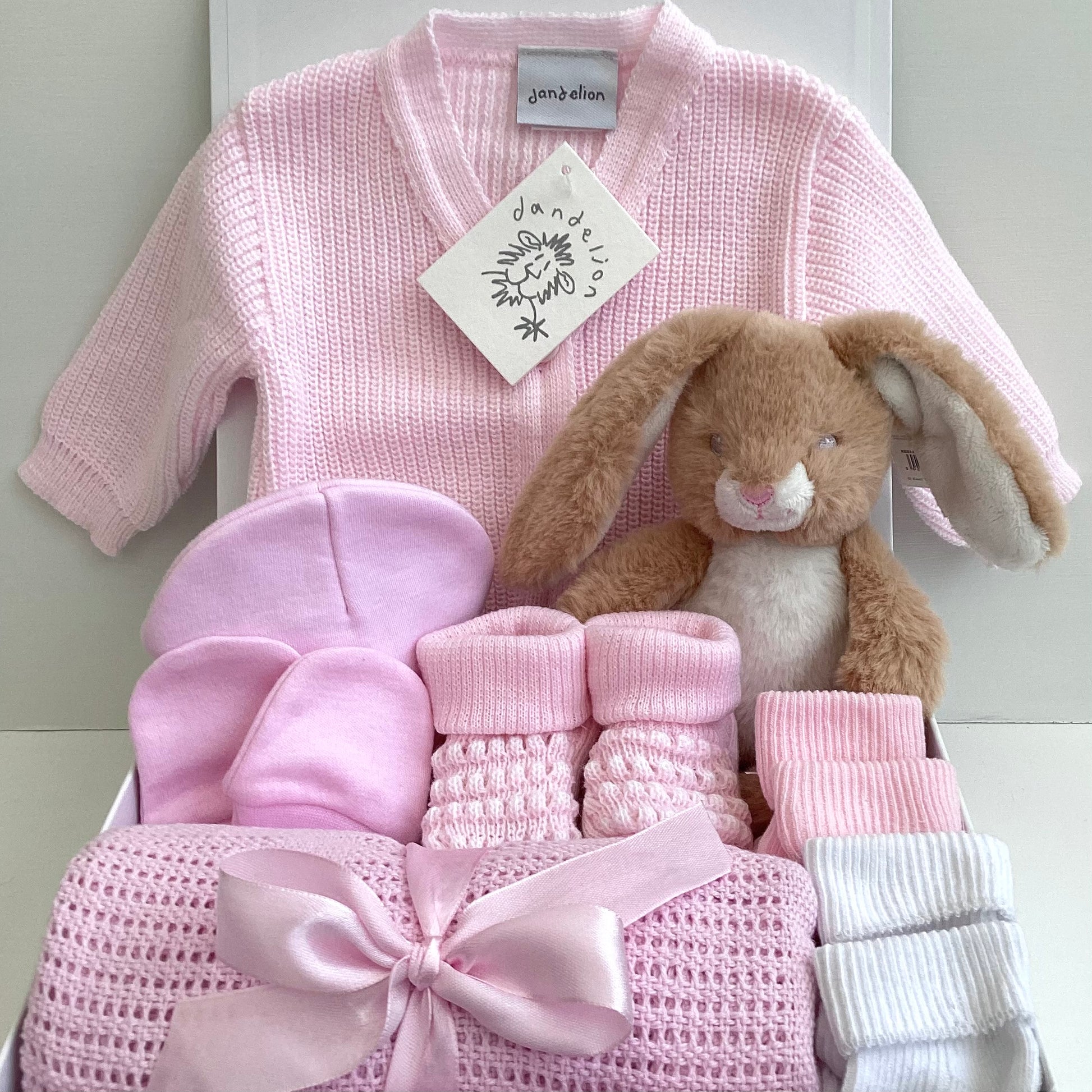 Our designer clothes are of high quality and made by Dandelion clothing. This gorgeous knitted soft cardigan will keep baby warm and cosy. For extra warmth the pink cellular blanket is perfect whilst also beneficial in regulating baby”s body heat. The adorable soft and cuddly bunny made by Keeleco has the softest fur and loves to be cuddled. Keeleco is a new brand from Keel Toys .Their toys are made from 100% recycled materials so making this an eco friendly bunny looking for a lovely new friend. Our gift box finishes with some essential scratch mitts, two pairs of cute socks, a cosy pink cradle cap and some adorable knitted booties. If you’re looking for something special this is the perfect gift box💕