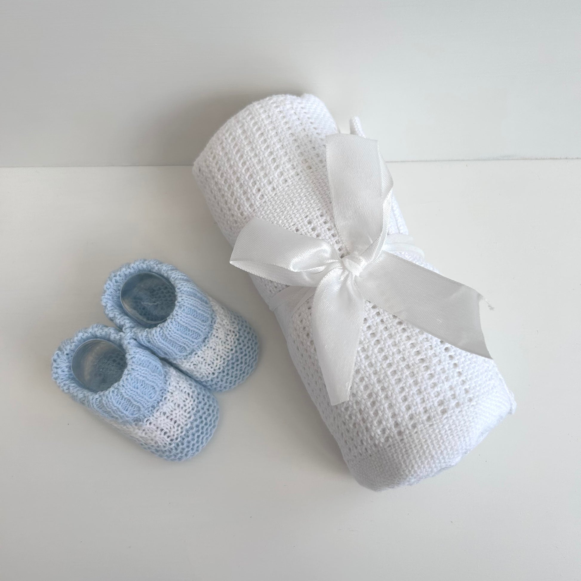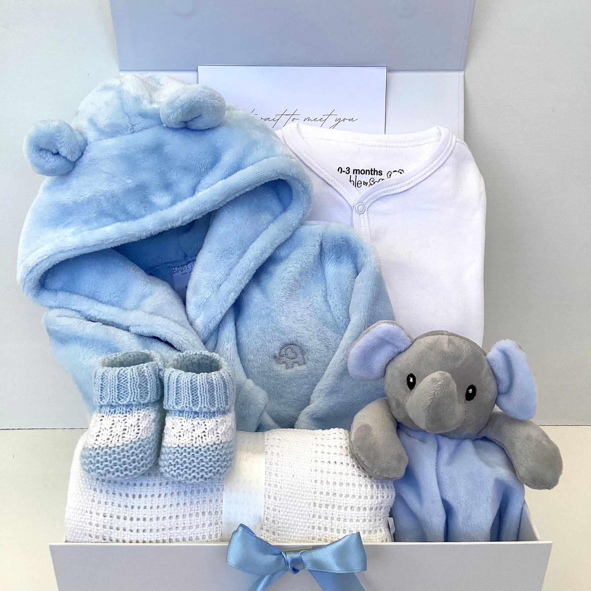 This cute gift box includes a beautiful soft light blue dressing gown.With a fluffy and luxurious texture the dressing gown is perfect for before bedtime for providing warmth, comfort and cuteness. Our beautifully presented gift box also includes a 100% cotton cellular blanket. Cellular blankets are fantastic for keeping baby warm whilst helping to regulate baby”s body heat throughout the night. An essential sleep suit is cosy and comfortable and our cute elephant comforter will make a special best friend for a little one. The adorable blue and white knitted booties are perfect for keeping little toes warm. 💙