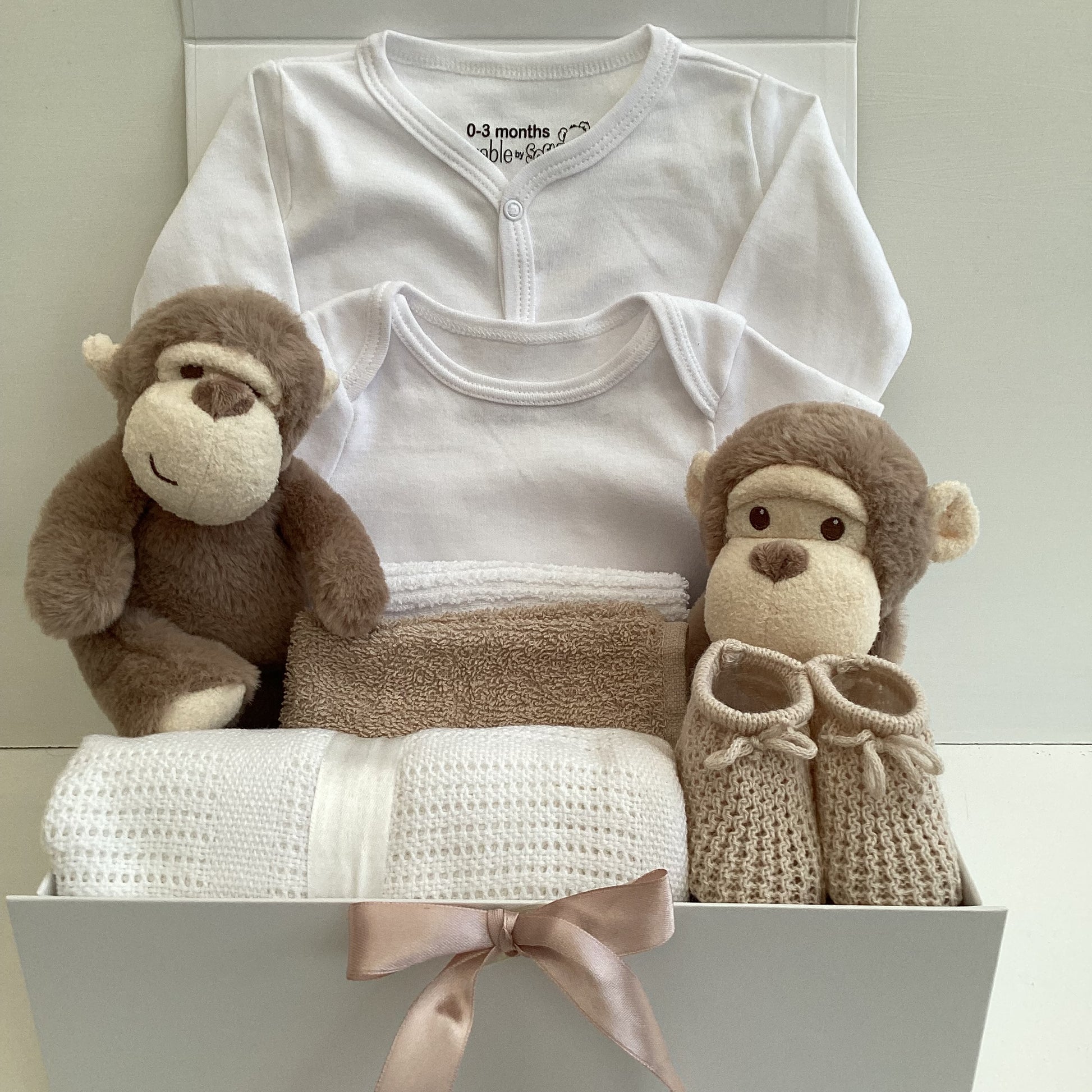 This perfect gift box is full of essentials including a gorgeous monkey soft toy with matching monkey comforter both made by Keeleco. These cute and cuddly monkey’s have the softest fur and will make a special friend for a little one. They loves snuggles and are perfect for tiny hands.