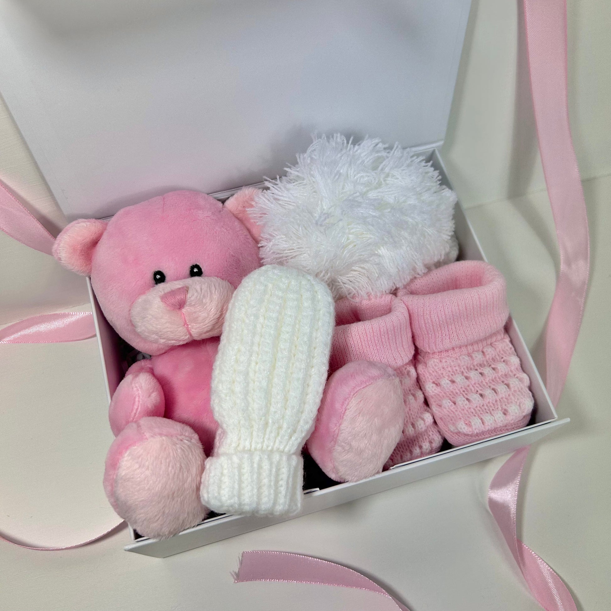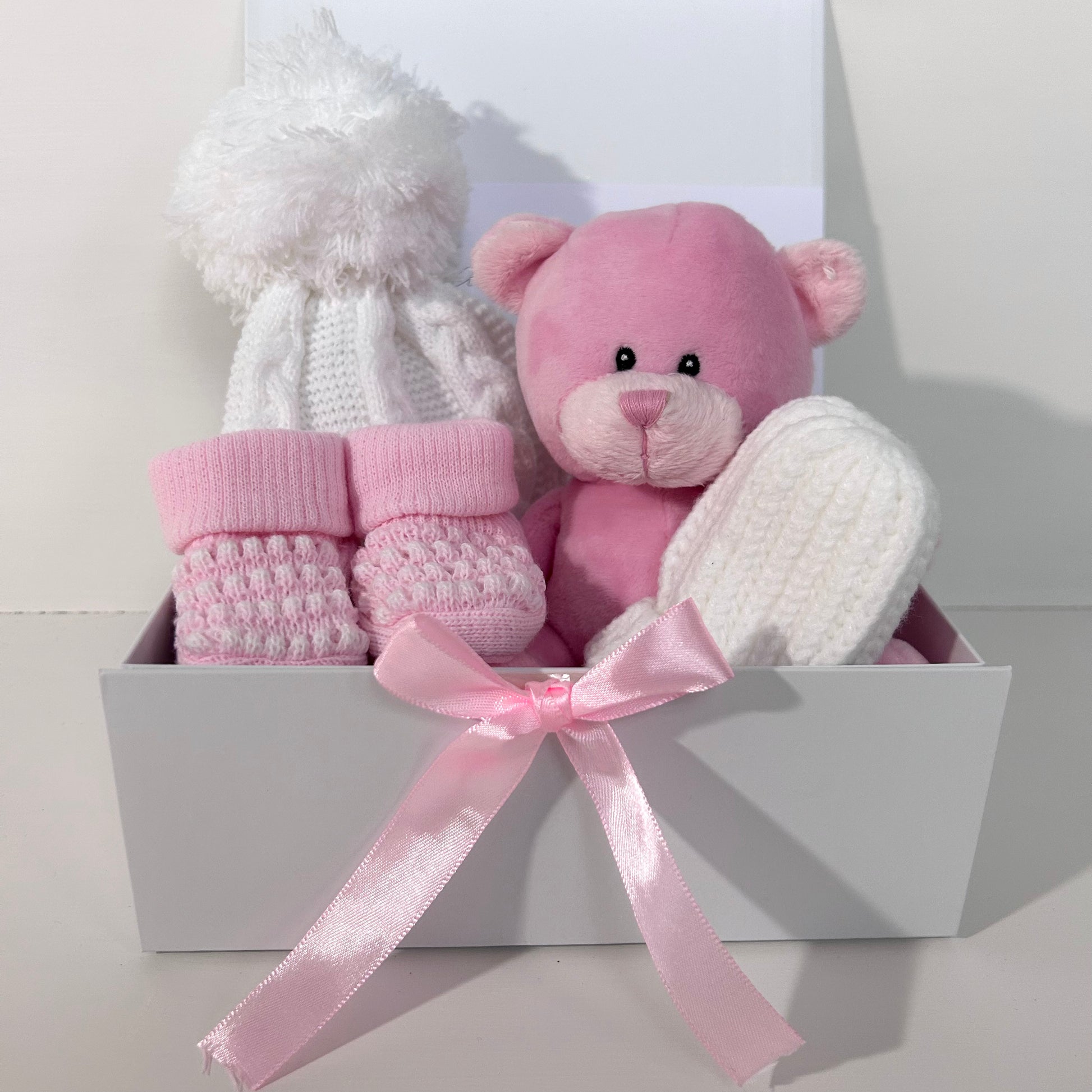 This perfect gift box is packed with new born essentials including this cute little teddy bear. With a soft and luxurious texture this bear is the perfect cuddly friend providing warmth, comfort and cuddles for a little one. Our beautifully presented gift box also includes a warm and cosy white knitted bobble hat, with white knitted mitts and the cutest pink knitted bootie socks to complete the cosy and comfy feel. 💕