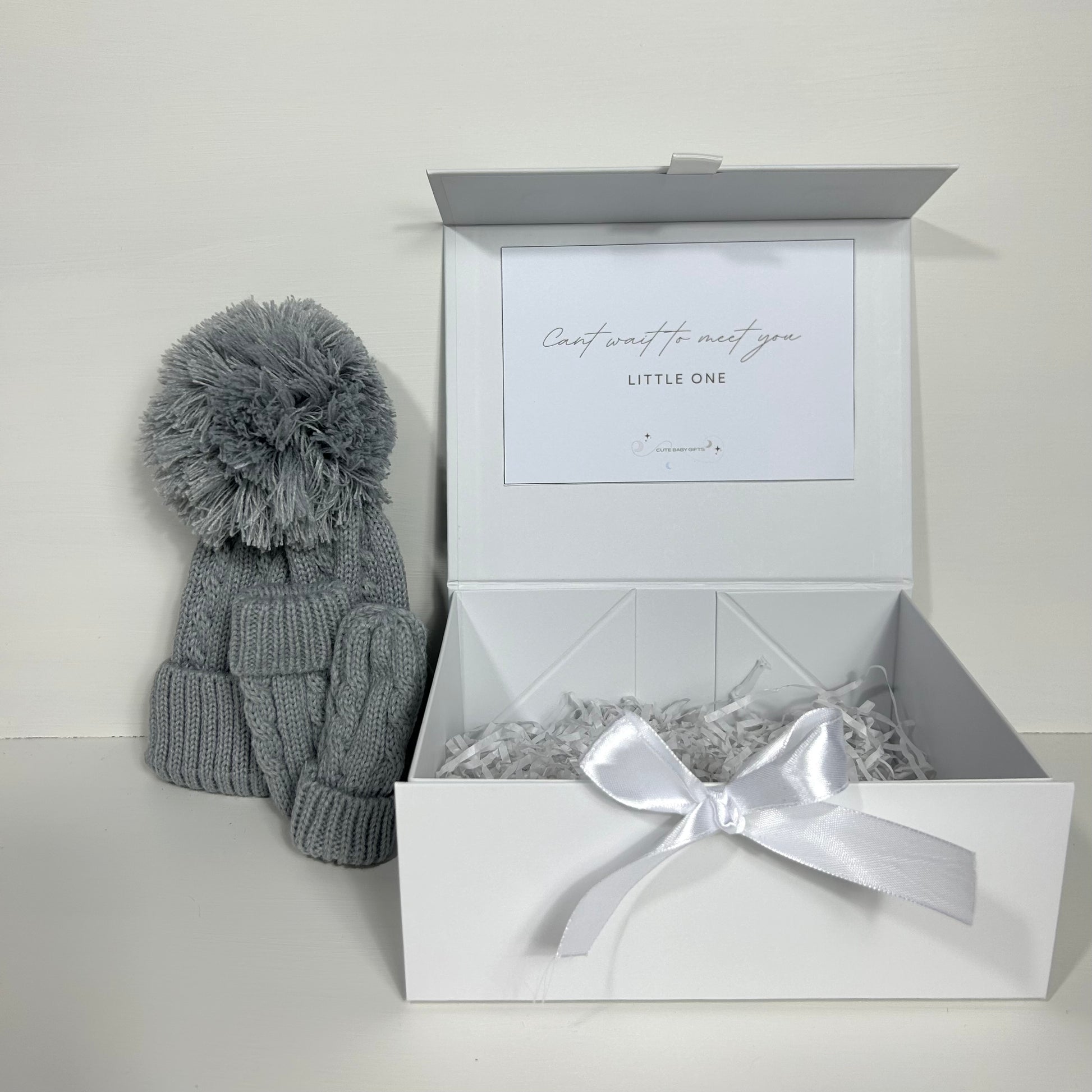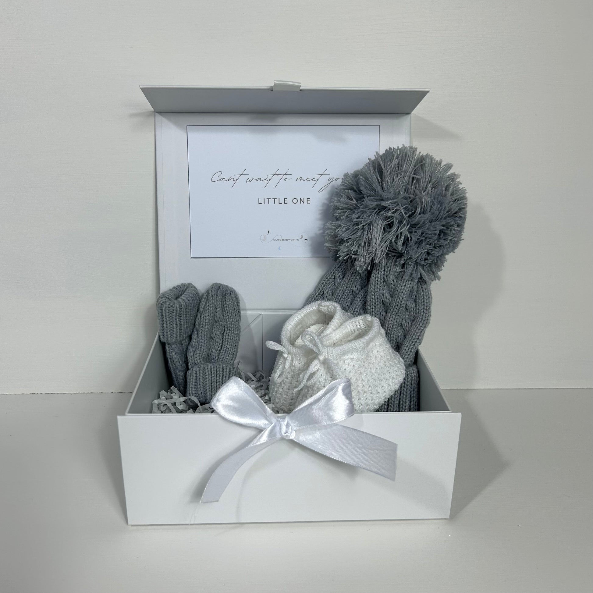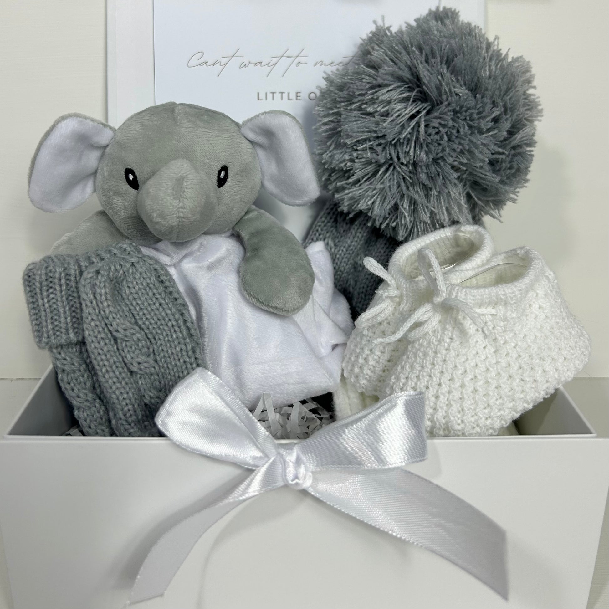 Our elephant comforter is perfect for tiny hands and makes a special friend and loves to be cuddled .Our beautifully presented gift box also includes a cosy and warm knitted grey bobble hat, with matching grey knitted mitts. The white knitted booties are adorable and are a perfect gift for a new baby.🤍