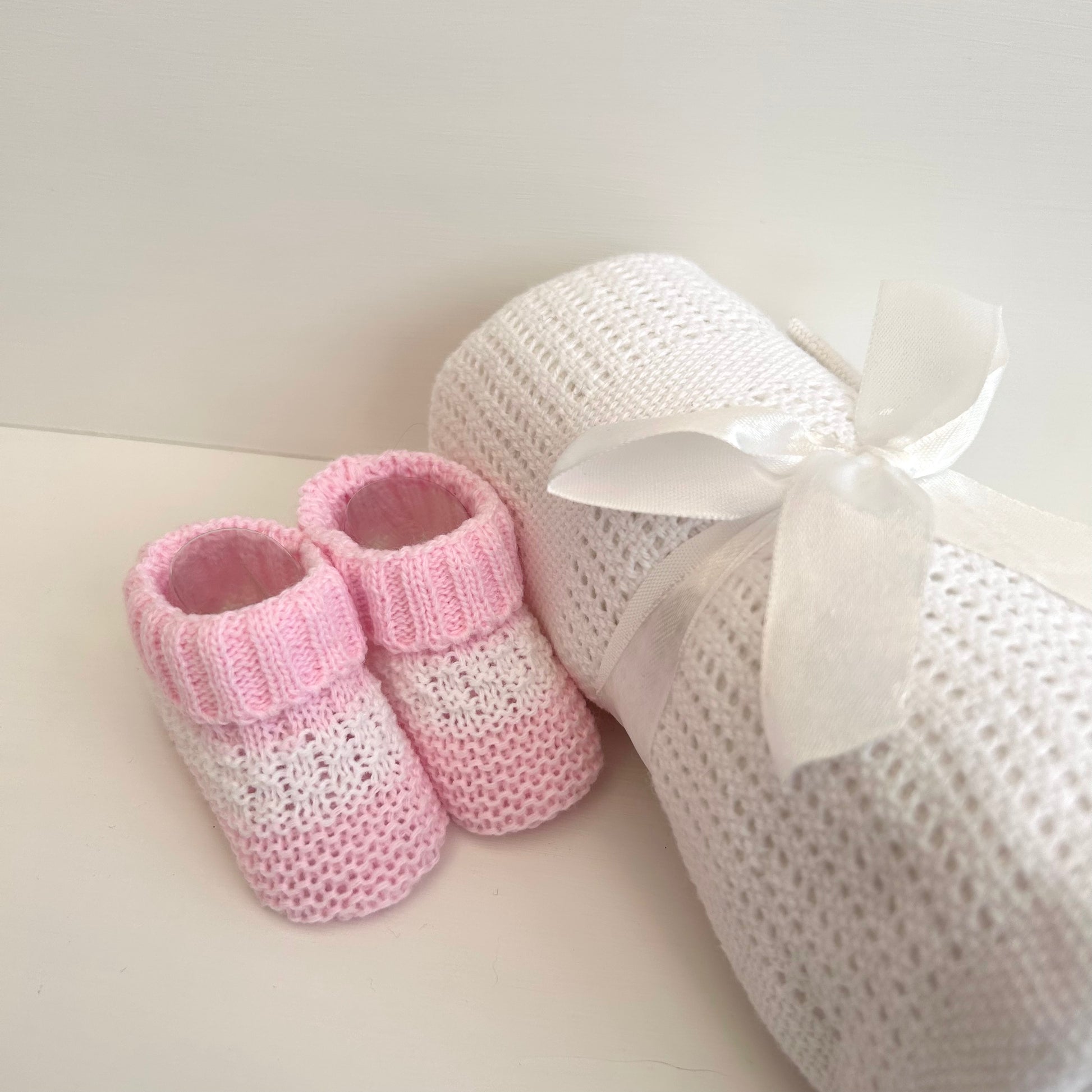 This perfect gift box is packed with new born essentials including a gorgeous pink dressing gown.With a soft and luxurious texture the dressing gown is the perfect choice in providing warmth, comfort and cuteness before bedtime. Our beautifully presented gift box also includes a white 100% cotton cellular blanket which is perfect for keeping baby warm while regulating body heat throughout the night. The white sleep suit and matching vest are cosy and comfortable helping baby get a good nights sleep. The adorable pink and white knitted booties are just perfect for keeping tiny toes cosy. Our elephant comforter makes a lovely friend for your little one and is looking for that special someone for extra snuggles at bedtime. 💕