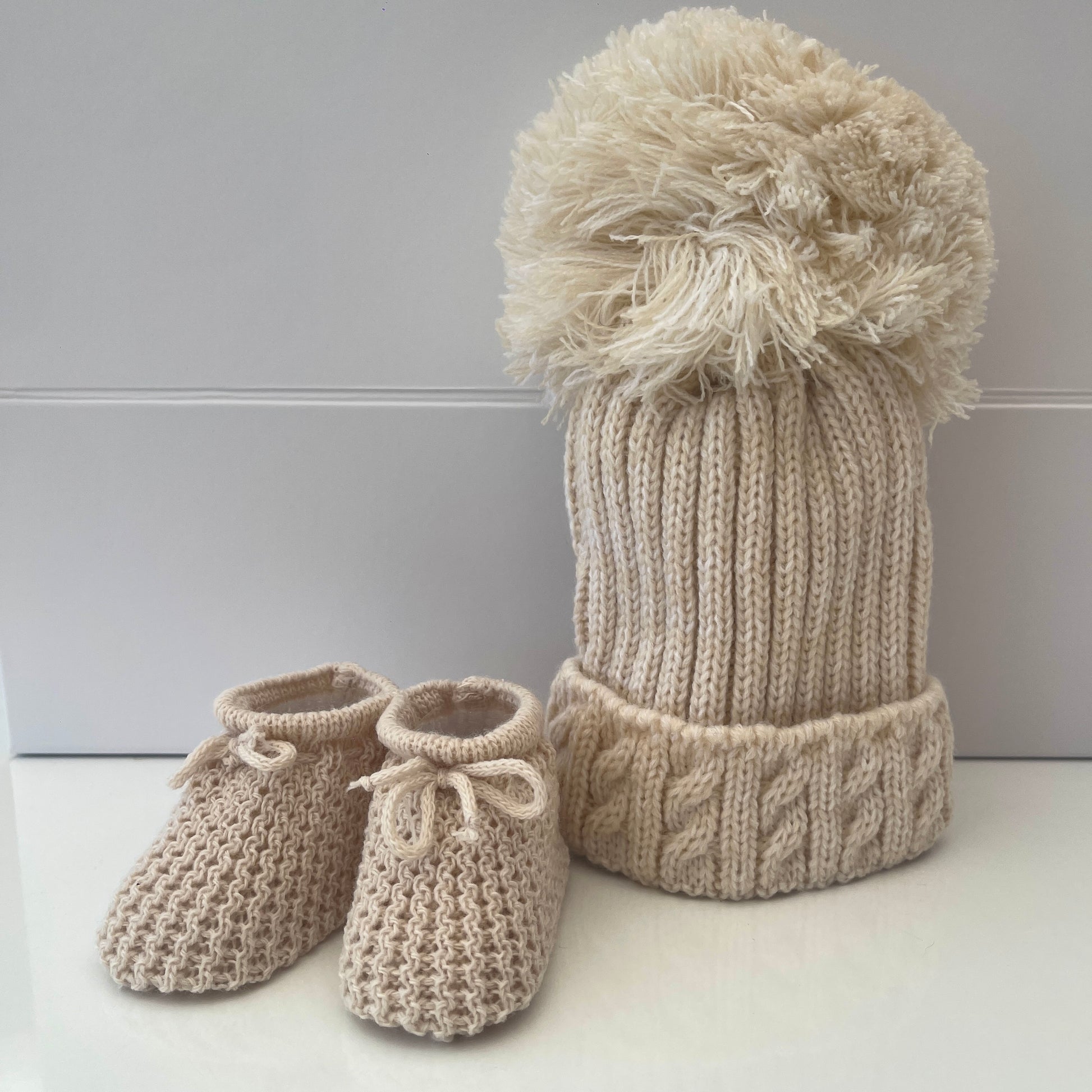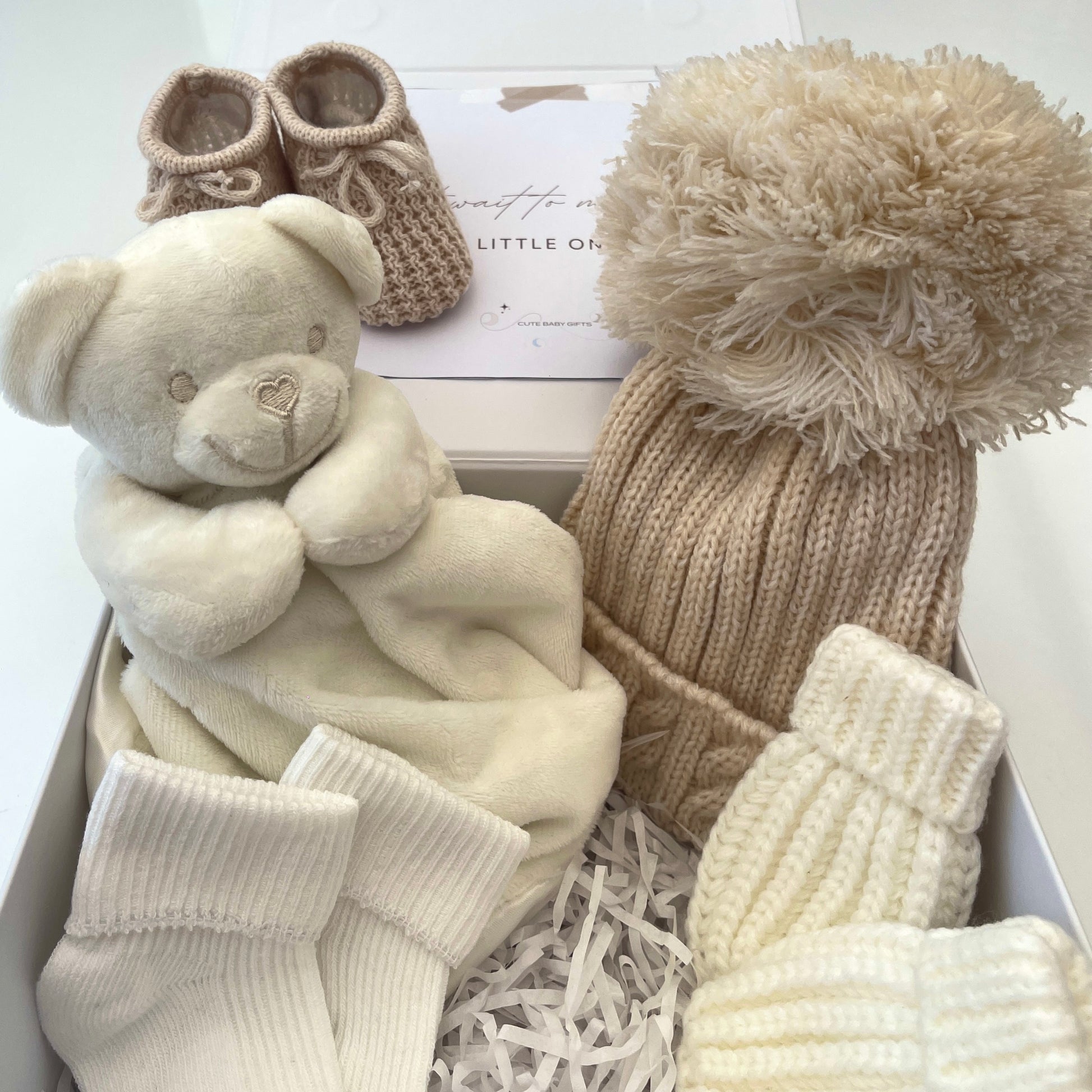 This perfect gift box is packed with new born essentials to keep baby warm including the cream comforter Oakley the bear. With a soft and luxurious texture Oakley is the perfect cuddly friend providing warmth, comfort for baby.Our beautifully presented gift box also includes a cute knitted beige bobble hat, with cream knitted mitts, booties and socks to keep baby warm🤍