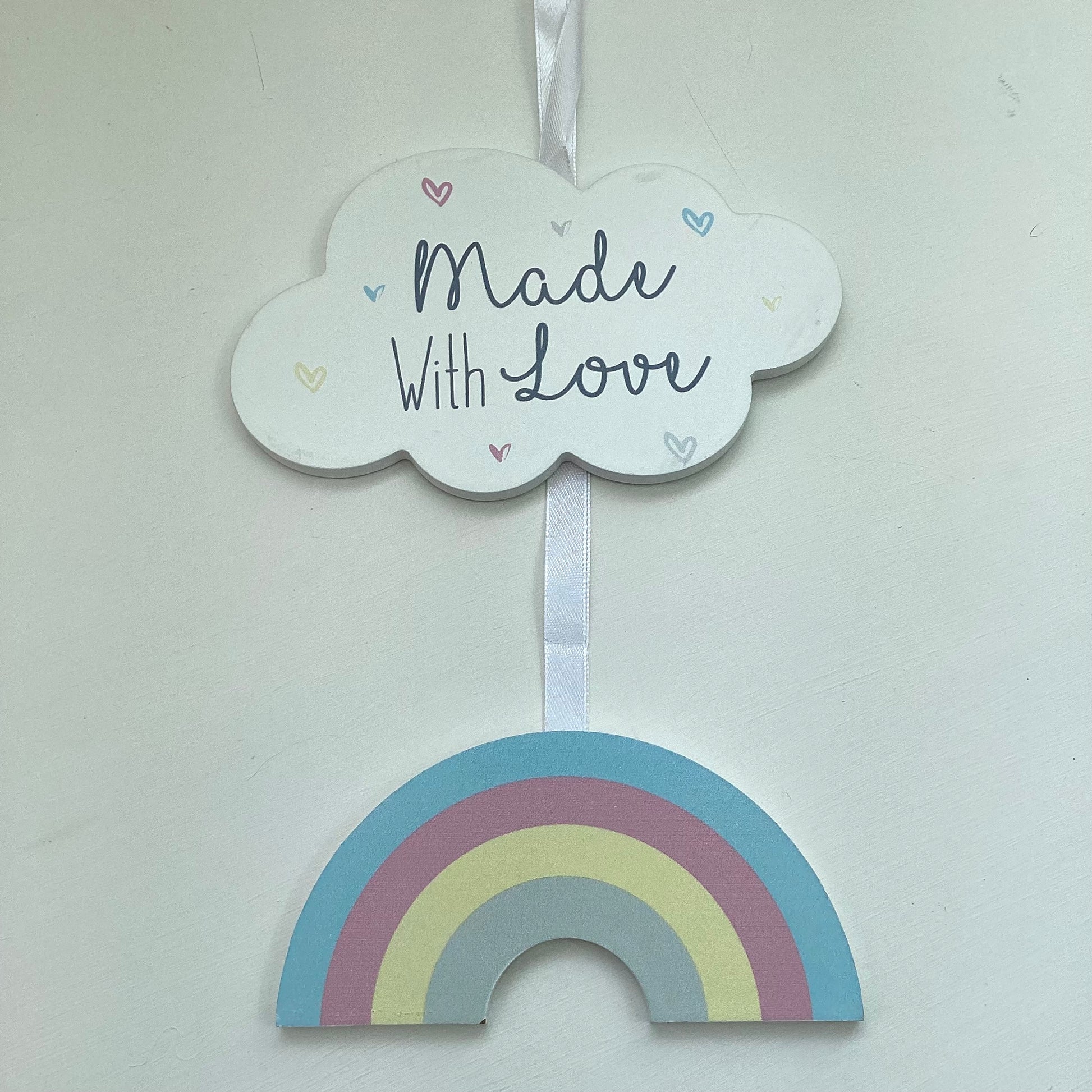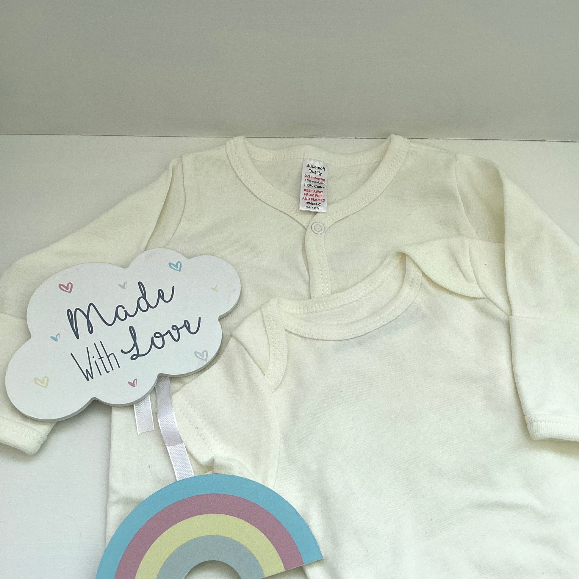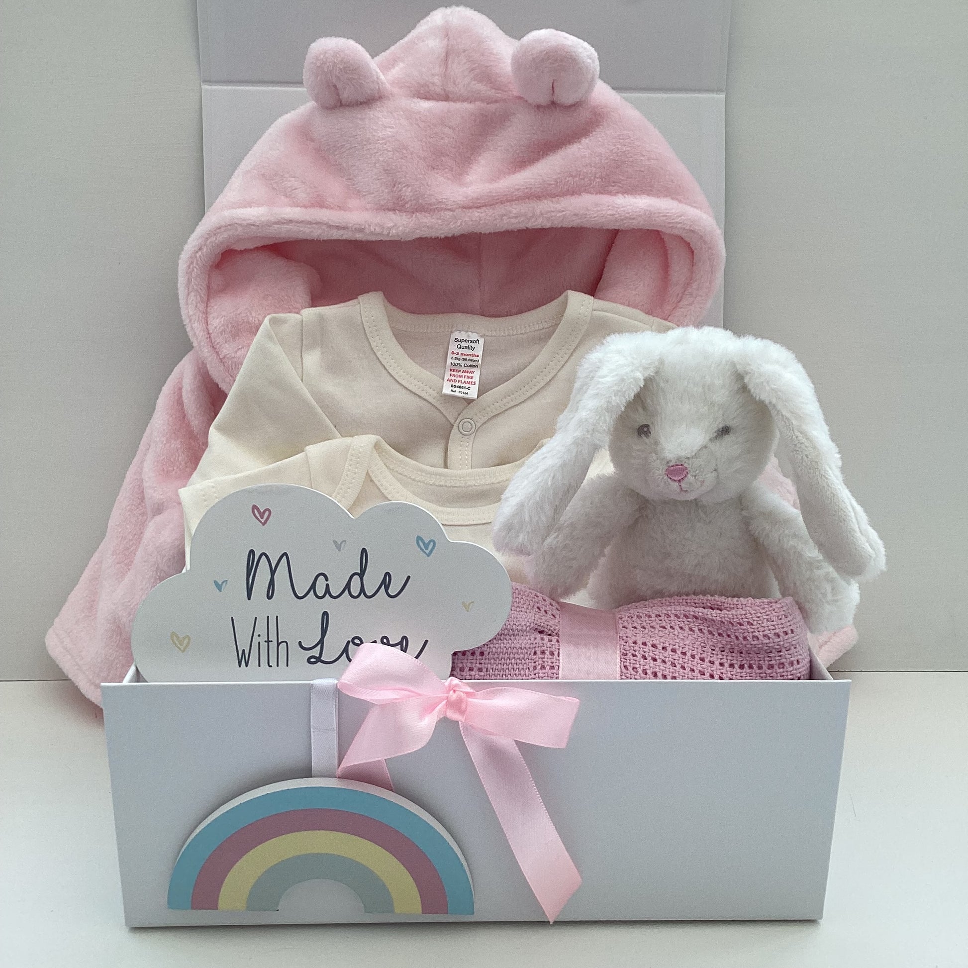 This perfect gift box is packed with everything you need for bedtime including a luxurious soft pink dressing gown.With a soft and luxurious texture the dressing gown is perfect for providing warmth, comfort and cuteness before bedtime. Our beautifully presented gift box also contains a gorgeous soft and cuddly bunny made be Keeleco. Keeleco is a new brand from Keel Toys .Their toys are made from 100% recycled materials so making this an eco friendly bunny looking for a lovely new friend. The soft cream sleep suit and vest will help keep baby comfy during the night and the cosy pink cellular blanket is perfect to keep baby warm whilst helping to regulate babies body temperature throughout the night. The ‘Made with Love’ wooden rainbow plaque is a lovely addition to baby”s nursery💕