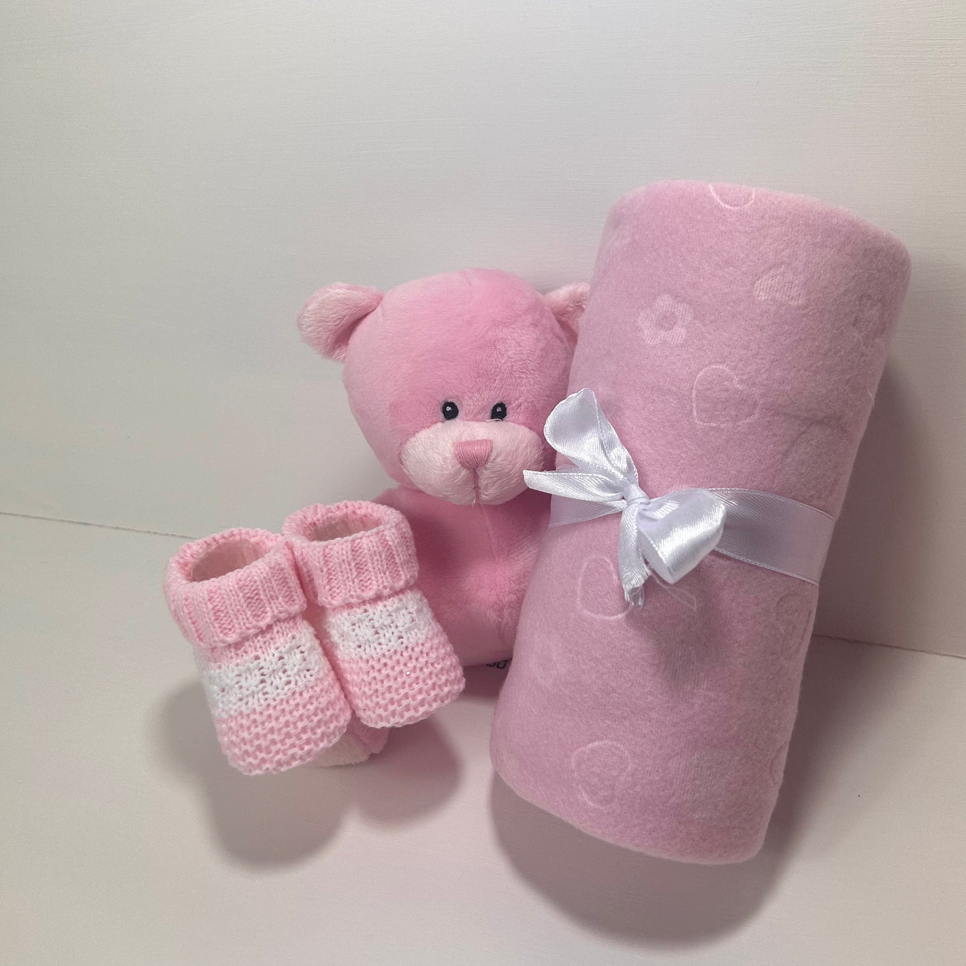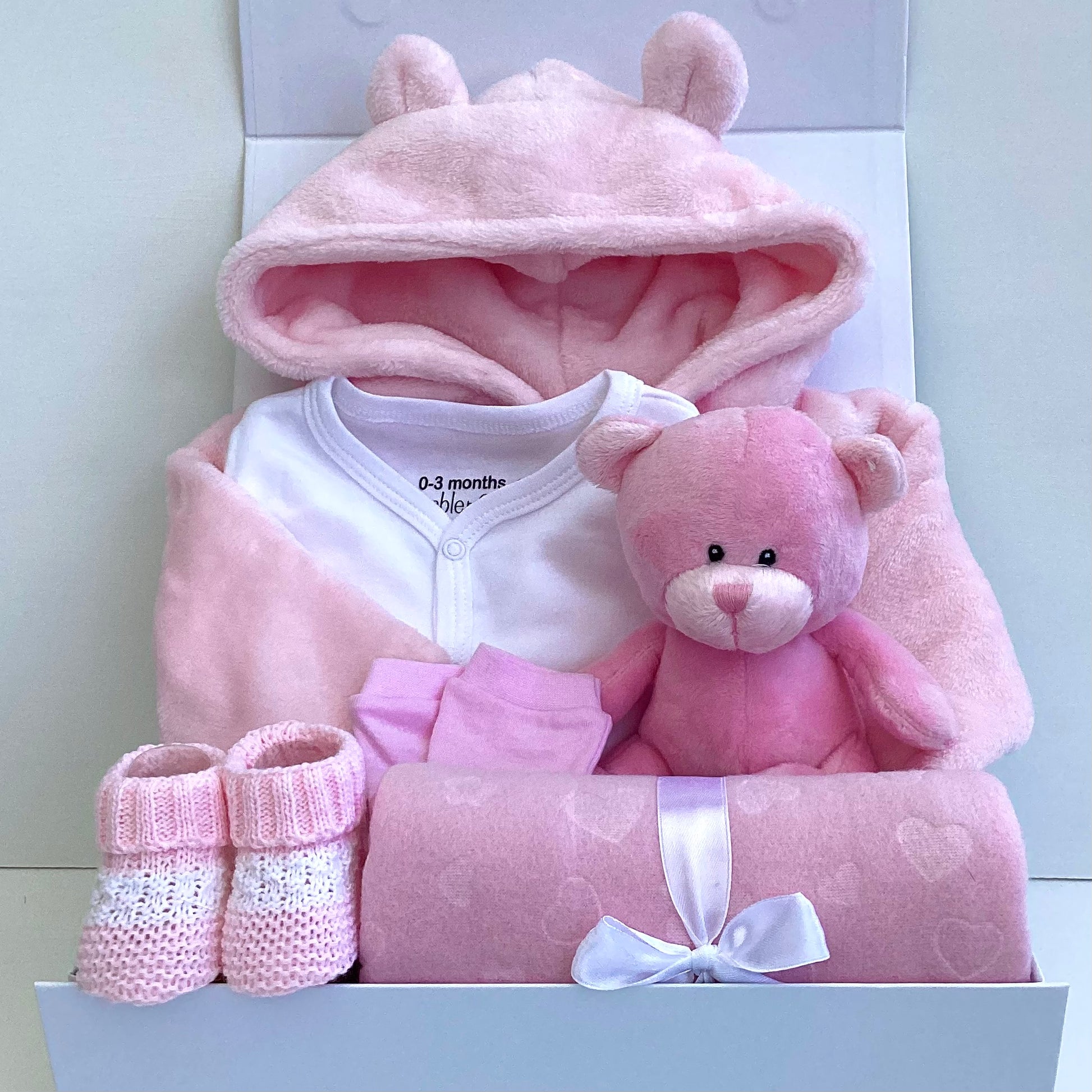 This perfect gift box is packed with everything you need for bedtime including a luxurious soft pink dressing gown.With a soft and luxurious texture the dressing gown is perfect for providing warmth, comfort and cuteness before bedtime.Our beautifully presented gift box also contains a cute pink fleece bear who loves to be cuddled and be a little ones best friend, The soft white sleep suit will help keep baby comfy during the night and the cosy fleece pink blanket is embossed with hearts and will keep baby warm. The knitted booties are adorable and a pair of scratch mitts are always a must for a sleeping baby💕
