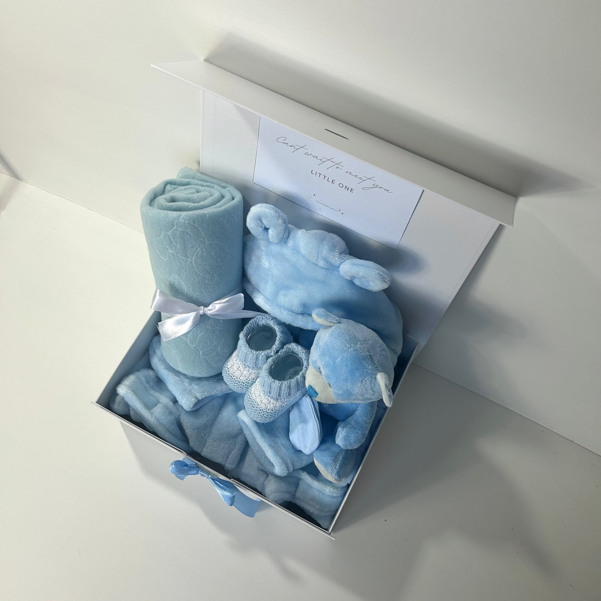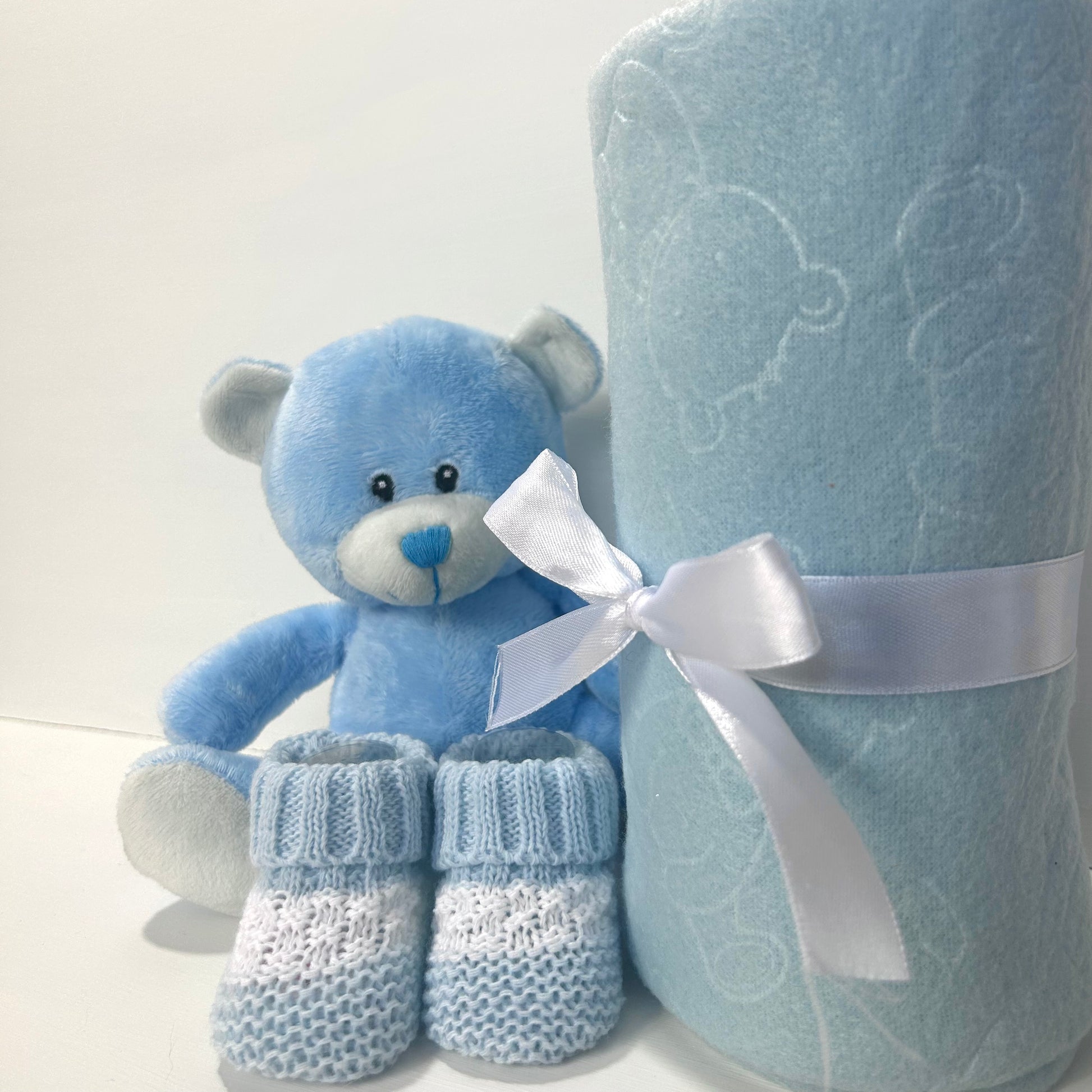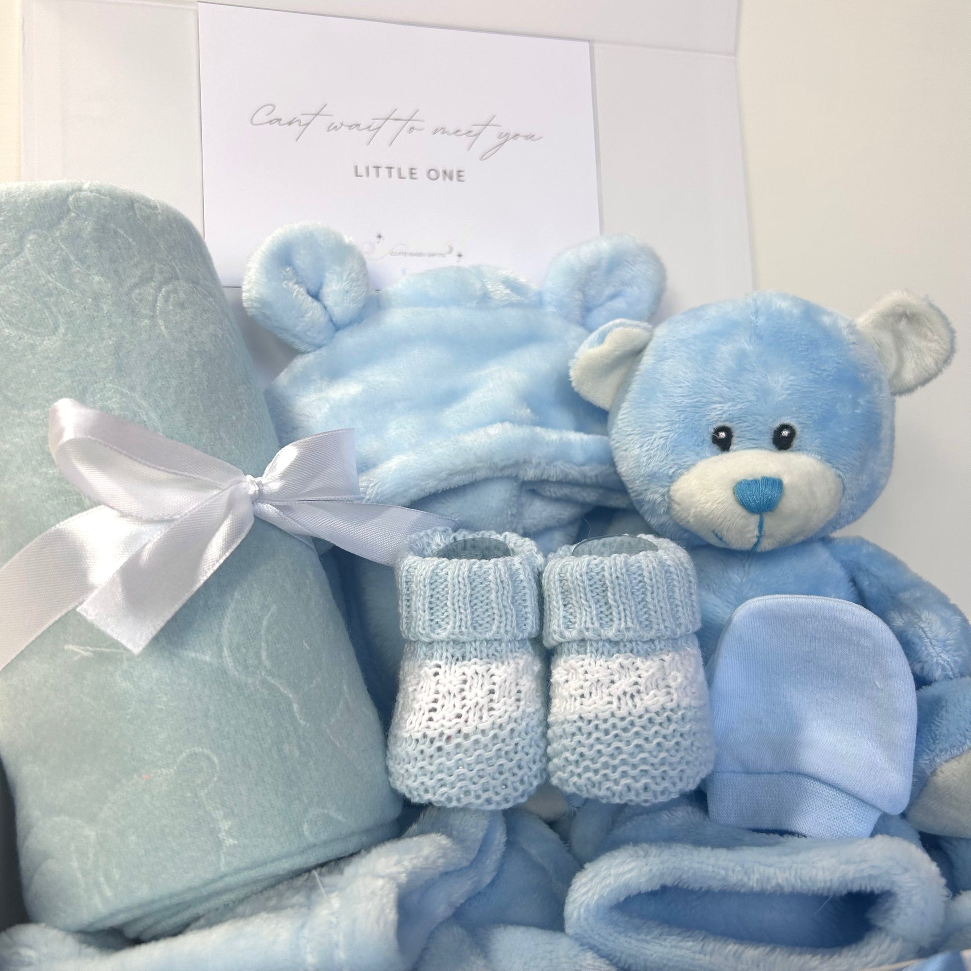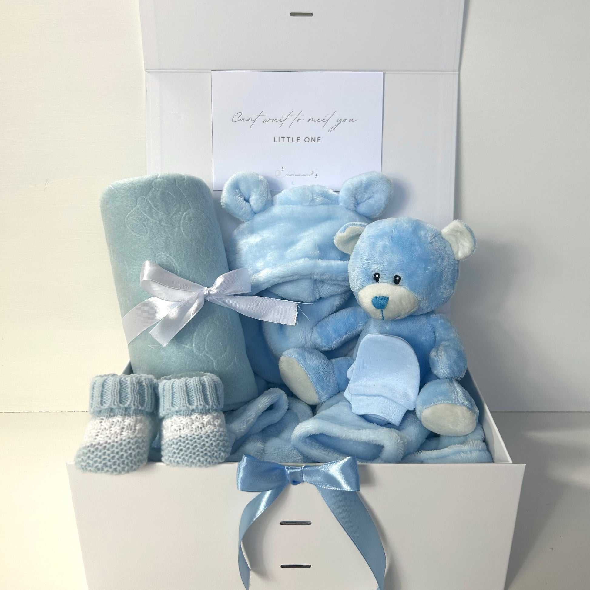This perfect gift box is packed with everything you need for bedtime including an adorable light blue dressing gown. With a soft and luxurious texture this dressing gown is perfect for providing warmth, comfort and super cuteness before bedtime. Our beautifully presented gift box also contains a blue cute fleece bear who loves to be cuddled and be a little ones best friend,The soft fleece blue blanket is embossed with bears and will keep baby warm. The knitted booties are adorable and a pair of scratch mitts are always a must for a sleeping baby💙