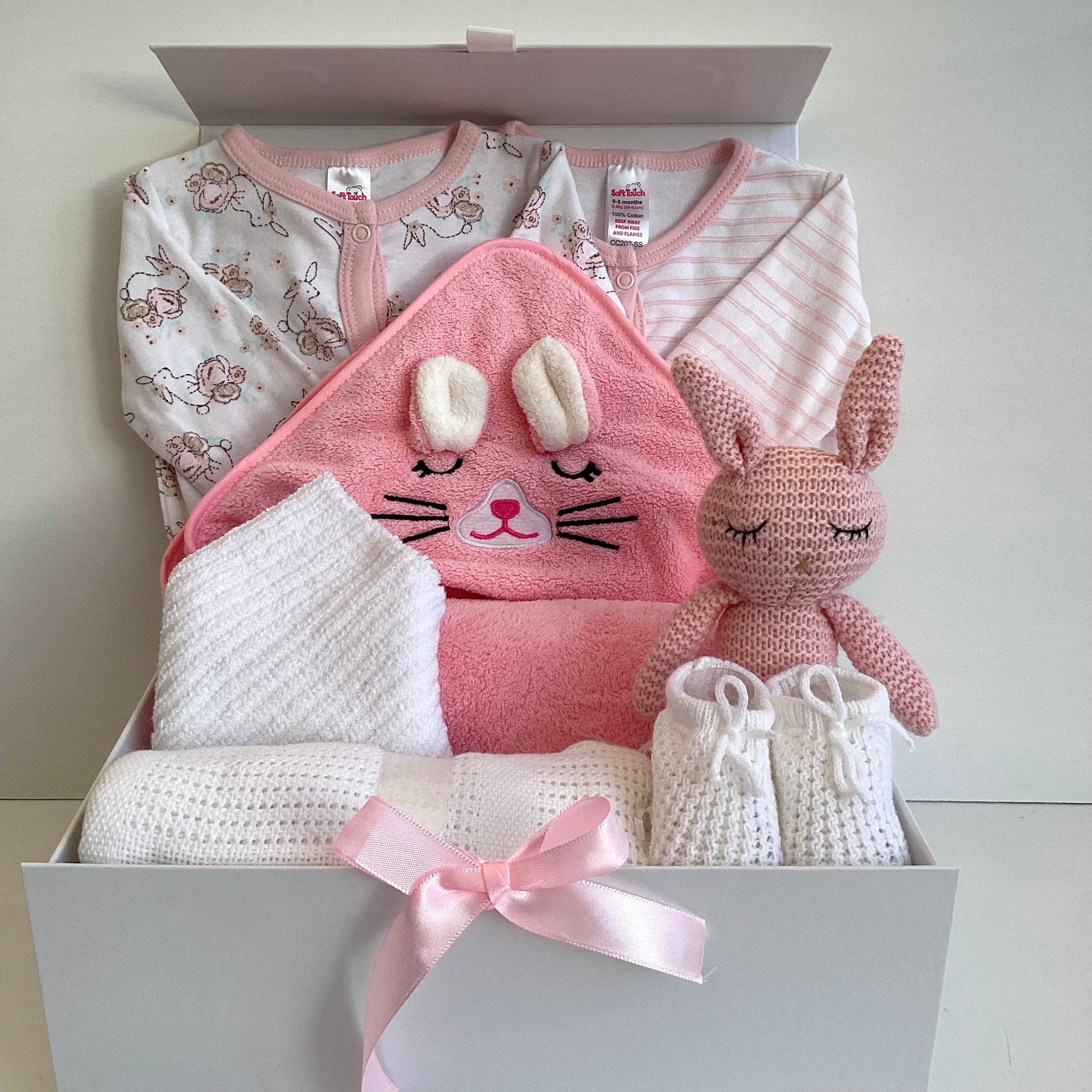 This perfect gift box is packed with new born essentials including our super cute pink bunny bath towel.This soft and fluffy bath towel is the perfect way to provide warmth, comfort and cuteness after bath time. Our beautifully presented gift box also includes an 100% cotton white cellular blanket making it comfortable and breathable for your new baby. Cellular blankets are also beneficial in helping regulate a baby”s body heat whilst they are sleeping. The soft and cosy sleep suits are warm and comfortable while baby is sleeping and the cute and cuddly knitted bunny comforter is perfect for tiny hands to snuggle. The white face cloth is soft and sensitive to baby”s skin and a pair of adorable knitted booties will keep little toes warm and cosy💕