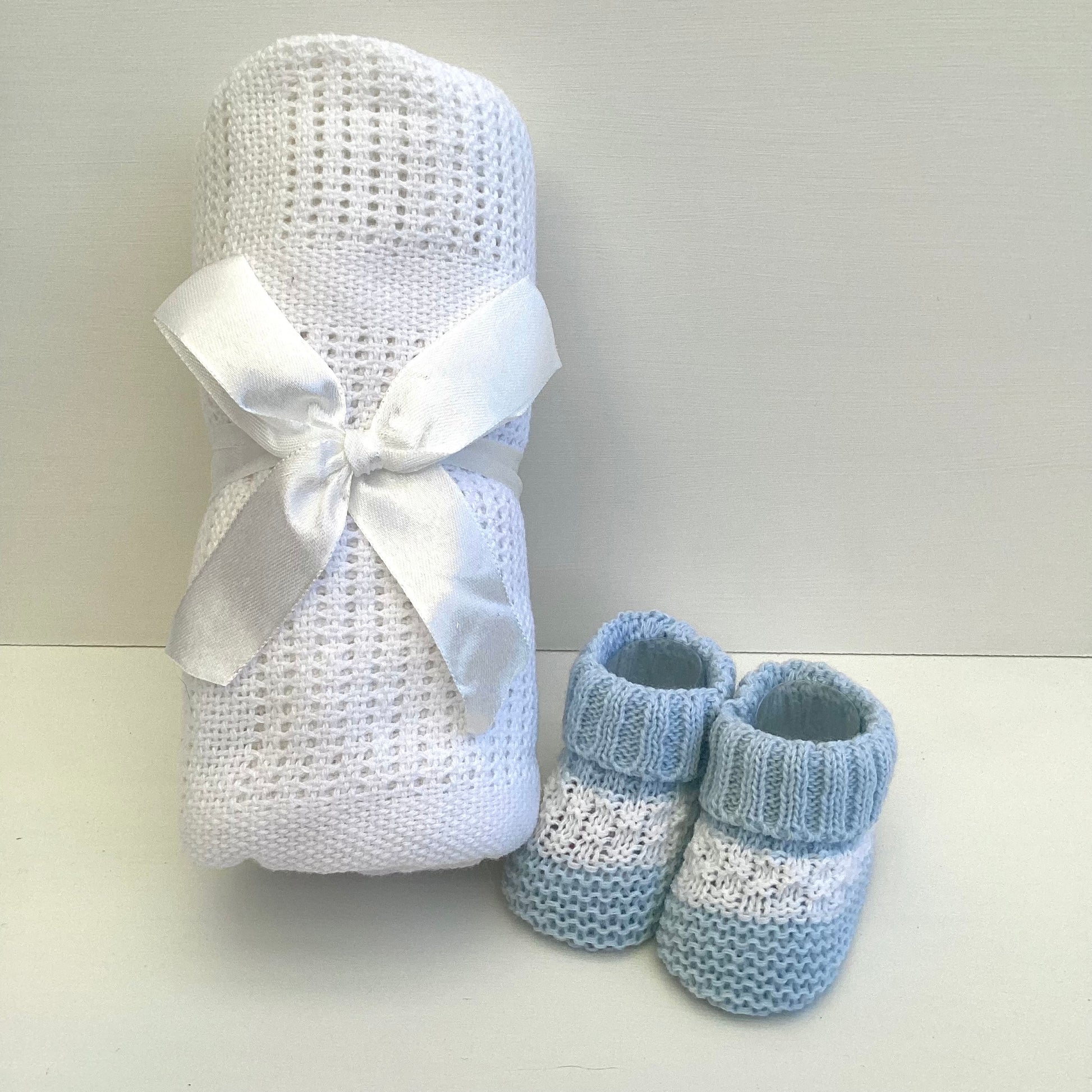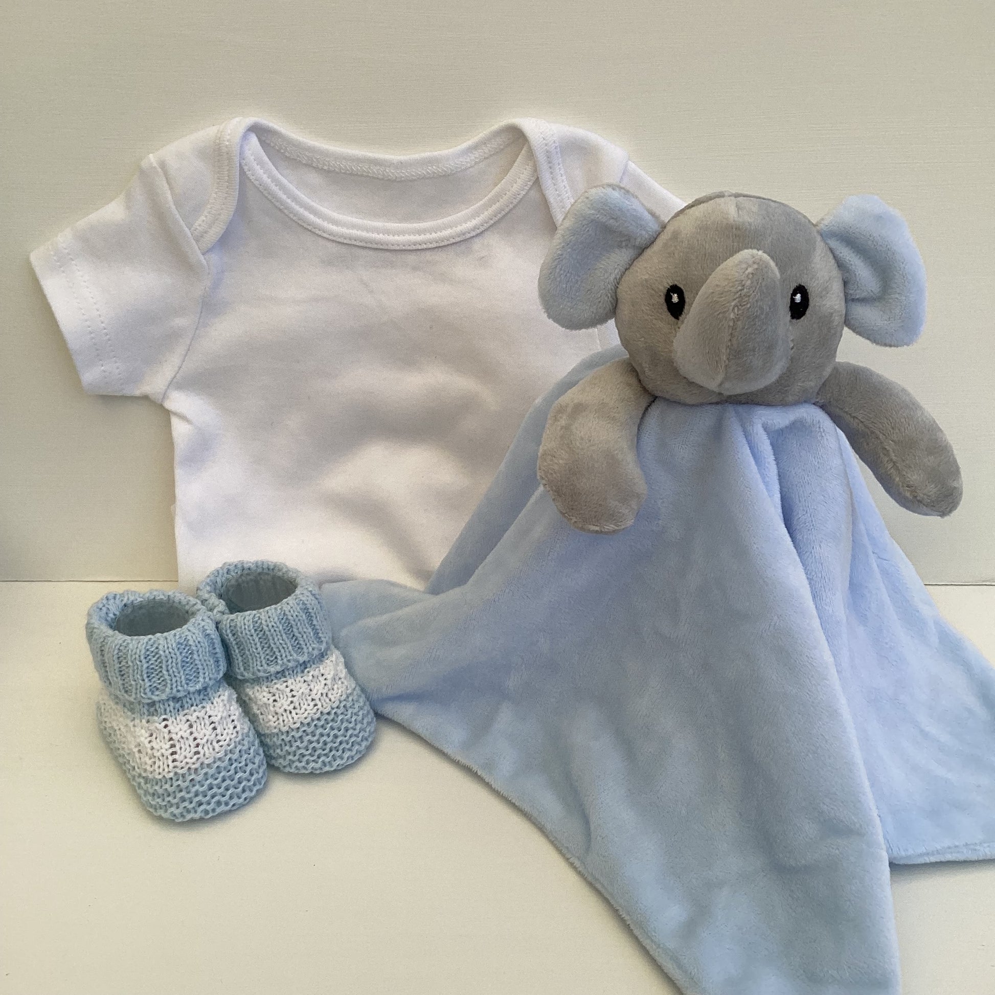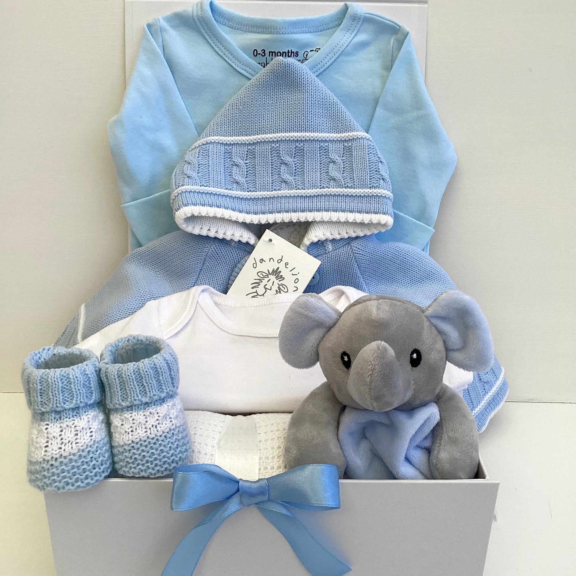 Our designer clothes are of high quality and made by Dandelion clothing. This gorgeous blue chunky knitted jacket with double breasted button fastenings is the perfect choice to keep baby warm whilst out and about. The soft sleep suit and vest will help keep baby comfortable while sleeping. For extra warmth on a chilly day wrap baby up in the cellular. blanket which is the ideal choice to help regulate baby”s body temperature. Matched together with the cutest blue and white knitted booties and our soft and cuddly elephant comforter you have everything you need for a cute day out. 💙