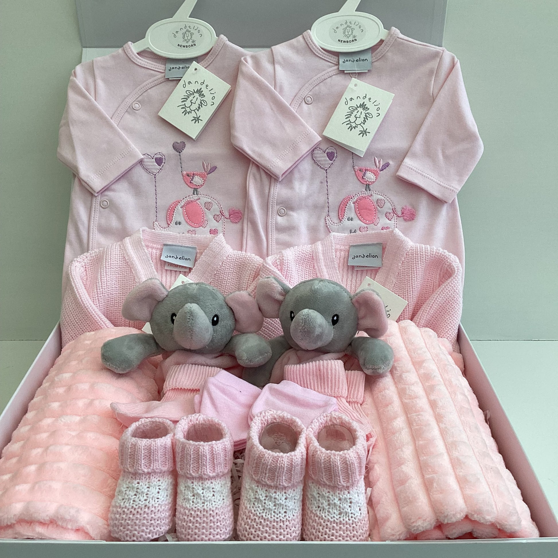 Our designer clothes are of the highest quality and made by Dandelion clothing. This lovely pink knitted cardigan is the perfect choice to keep baby warm whilst out and about. The gorgeous onesie is soft and cosy with a cute elephant motif design. For extra warmth on a chilly day the pink waffle blanket is the softest blanket you could wish for, perfect for a new baby. Our elephant comforter is soft and cuddly and makes a lovely friend to snuggle. Our gift box finishes with some adorable knitted booties and the essentials of socks and scratch mitts. If you’re looking for something special this is the perfect gift box💕