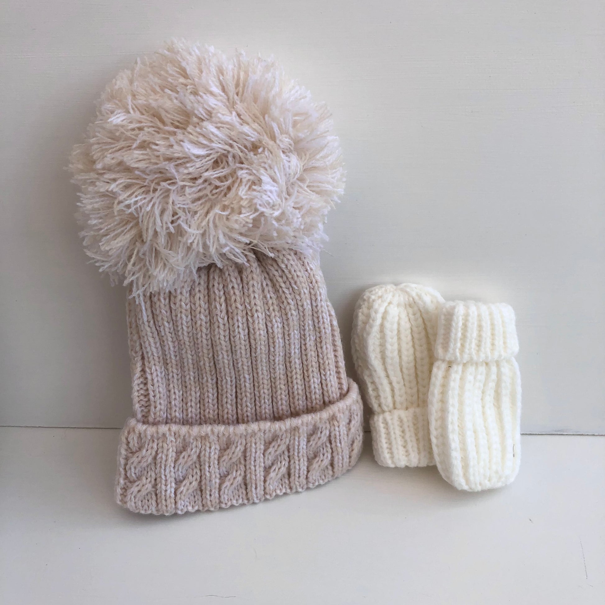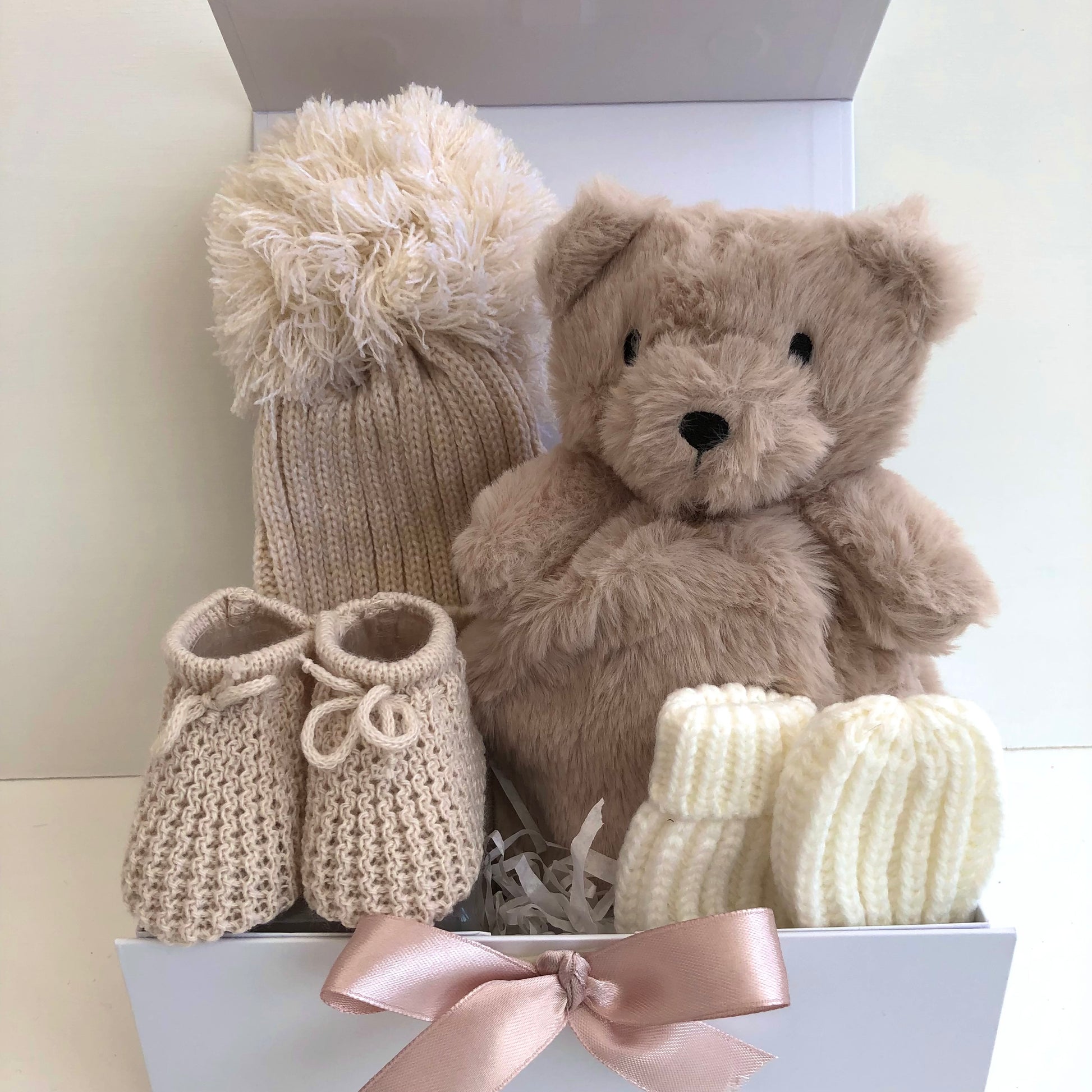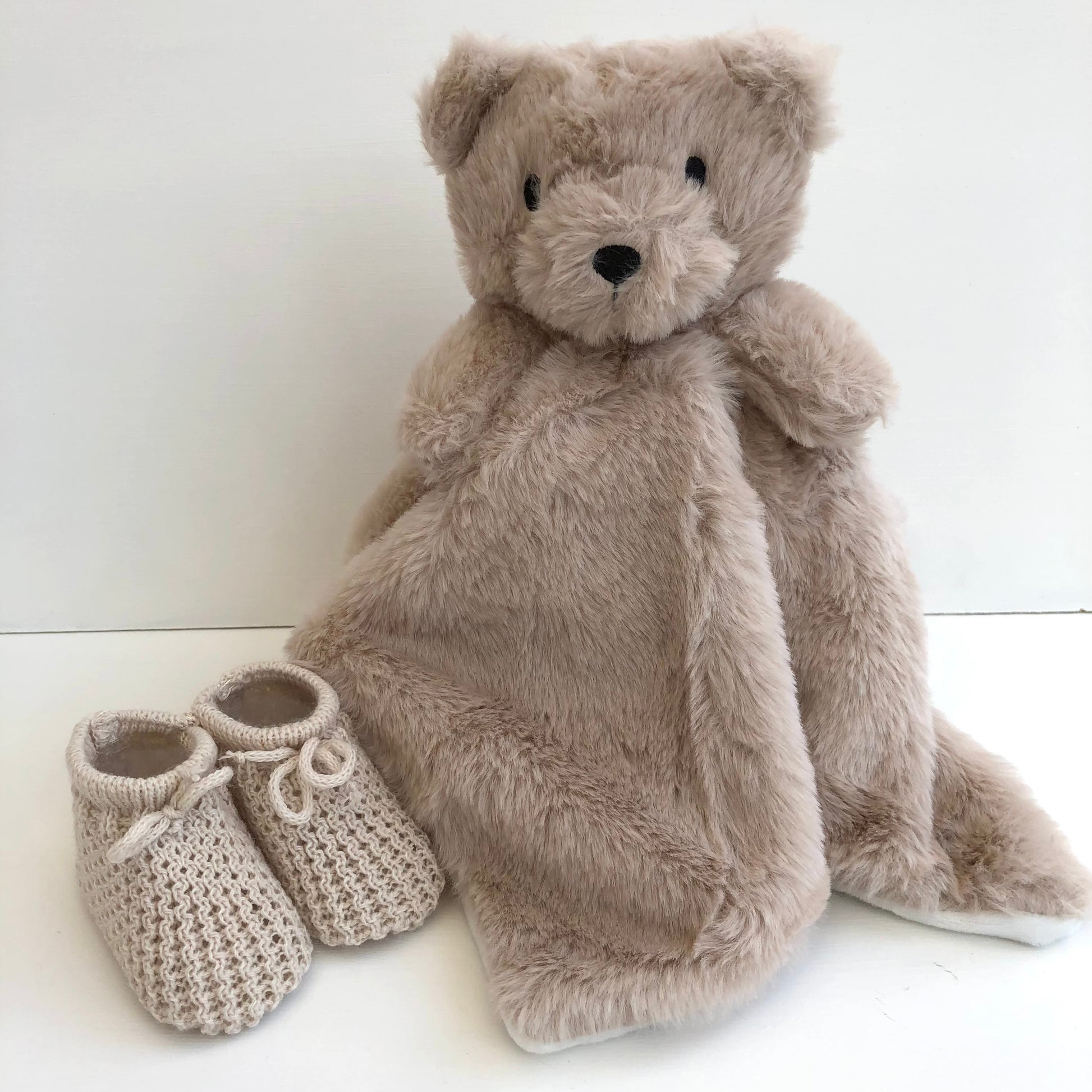 The bear comforter is soft and fluffy and loves to cuddle. He will make a special friend for a babies small hands to cuddle and love . Our beautifully presented gift box also includes a cosy and warm knitted beige bobble hat, with cream knitted mitts. The cutest knitted beige booties which are a perfect gift for a new baby.🤍
