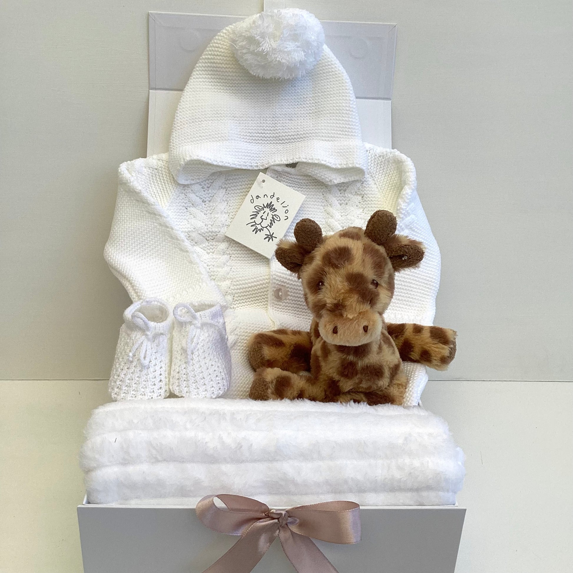 Our designer clothes are of high quality and made by Dandelion clothing. This gorgeous cable knitted pram suit with hood and cute Pom Pom is the perfect choice for a beautiful outfit for a day out with a new baby. For extra warmth on a chilly day wrap baby up in the waffle blanket which is the softest blanket you could wish for. This stunning gift box also includes the gorgeous giraffe made by Keeleco. This cute and cuddly giraffe has the softest fur and is perfect for little hands to cuddle. Keeleco is a new brand from Keel Toys .Their toys are made from 100% recycled materials so making this an eco friendly giraffe looking for a lovely new friend 🤍