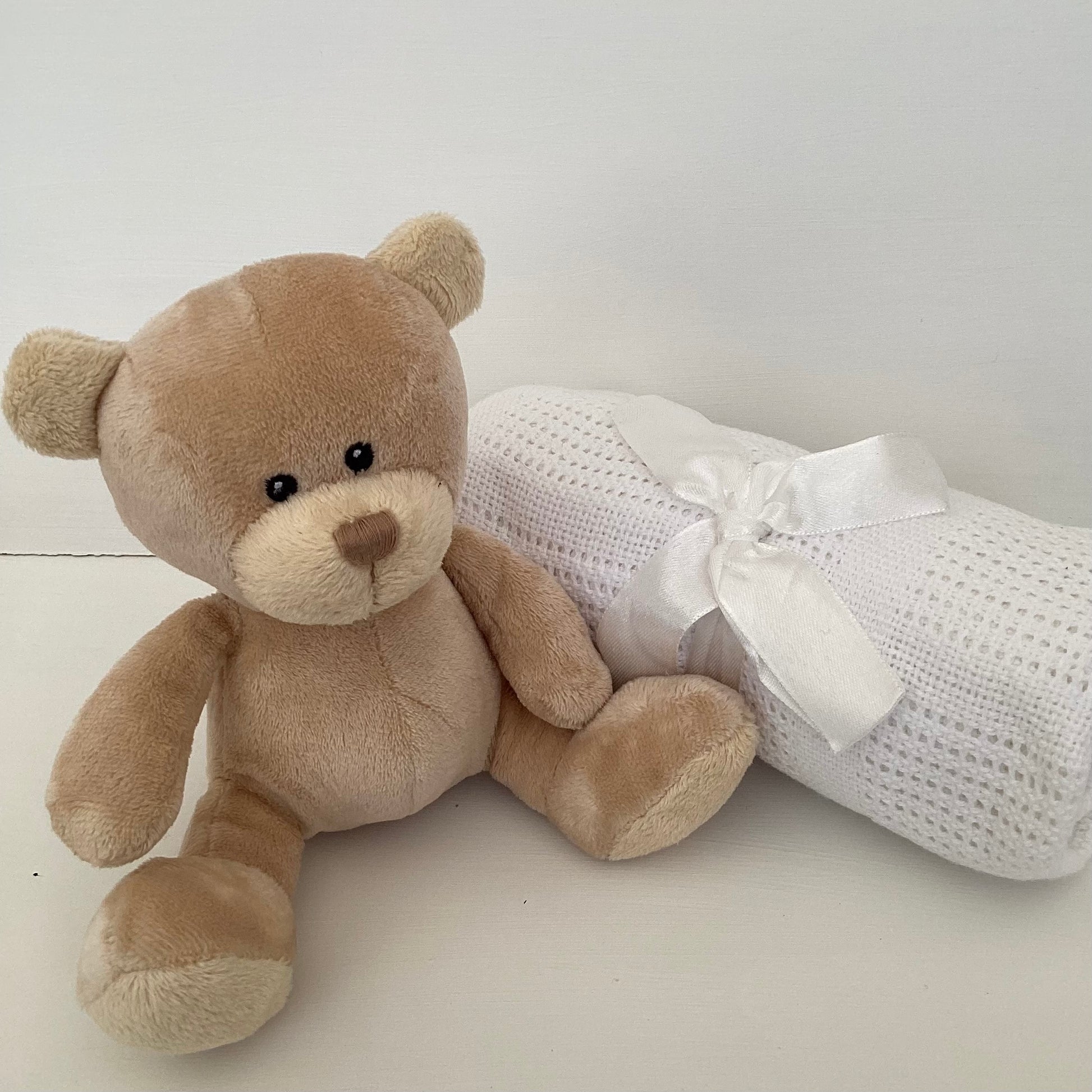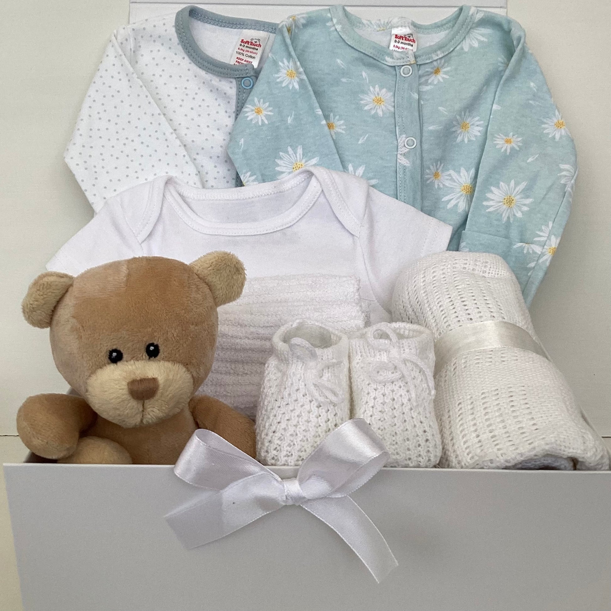 The two sleep suits are cute and comfortable with the essential white vest underneath for extra warmth. The white cellular blanket is a perfect choice for keeping baby warm throughout the night while helping to regulate baby’s body temperature whilst sleeping. The cute fleece bear is super soft for tiny hands, perfect for snuggles and cuddles with a special best friend . Our lovely gift box is finished with two soft and sensitive face cloths and a pair of adorable knitted booties that are a perfect gift for a new baby 🤍